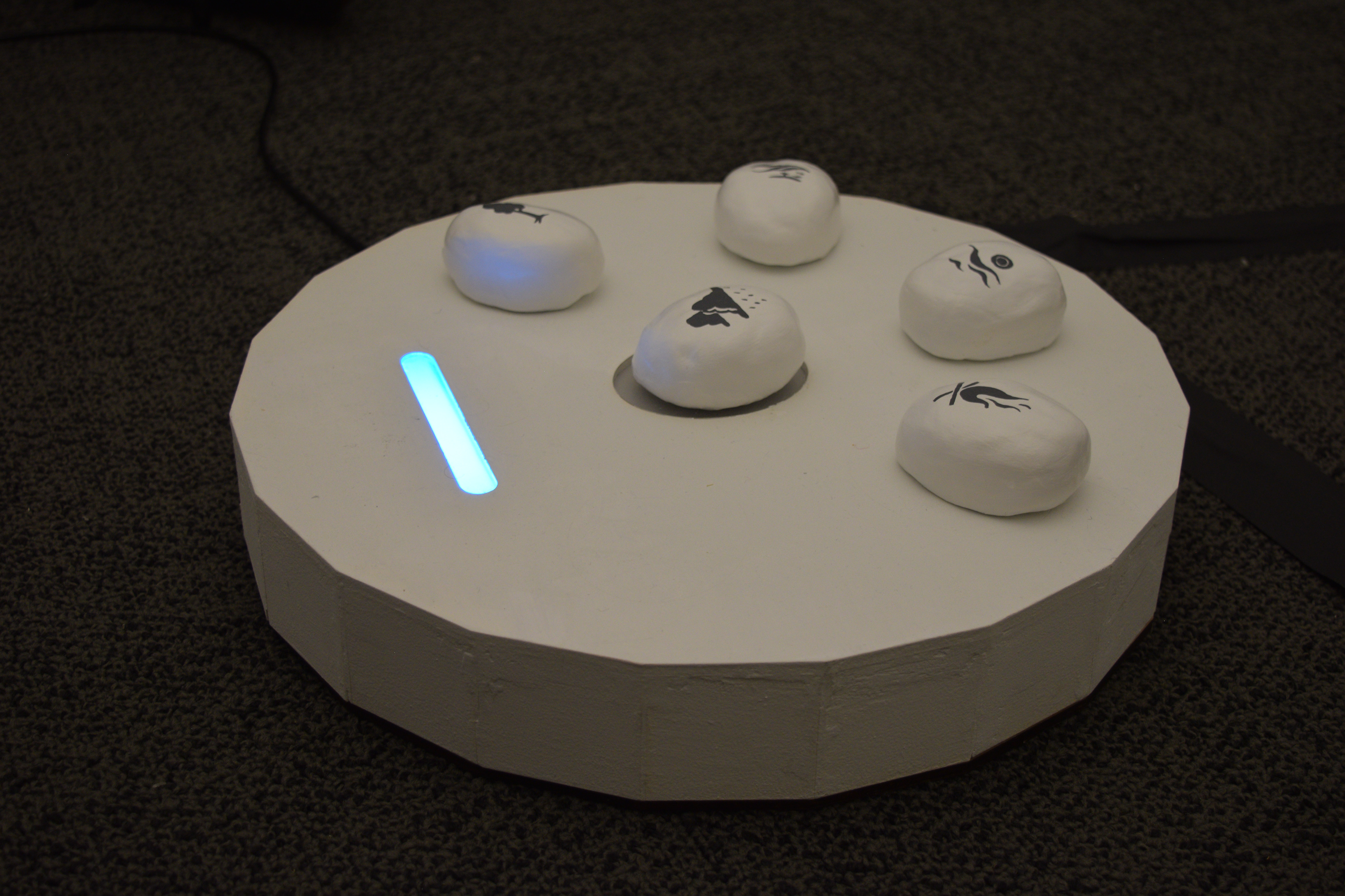 We created a tangible interface to allow the user to control the environment of the room. The five environments include: rainstorm, deep ocean, rainforest, beach, and desert. To change the environment, the user simply places a stone in the middle of the panel. The stones use RFID tags to signal which environment should be current.