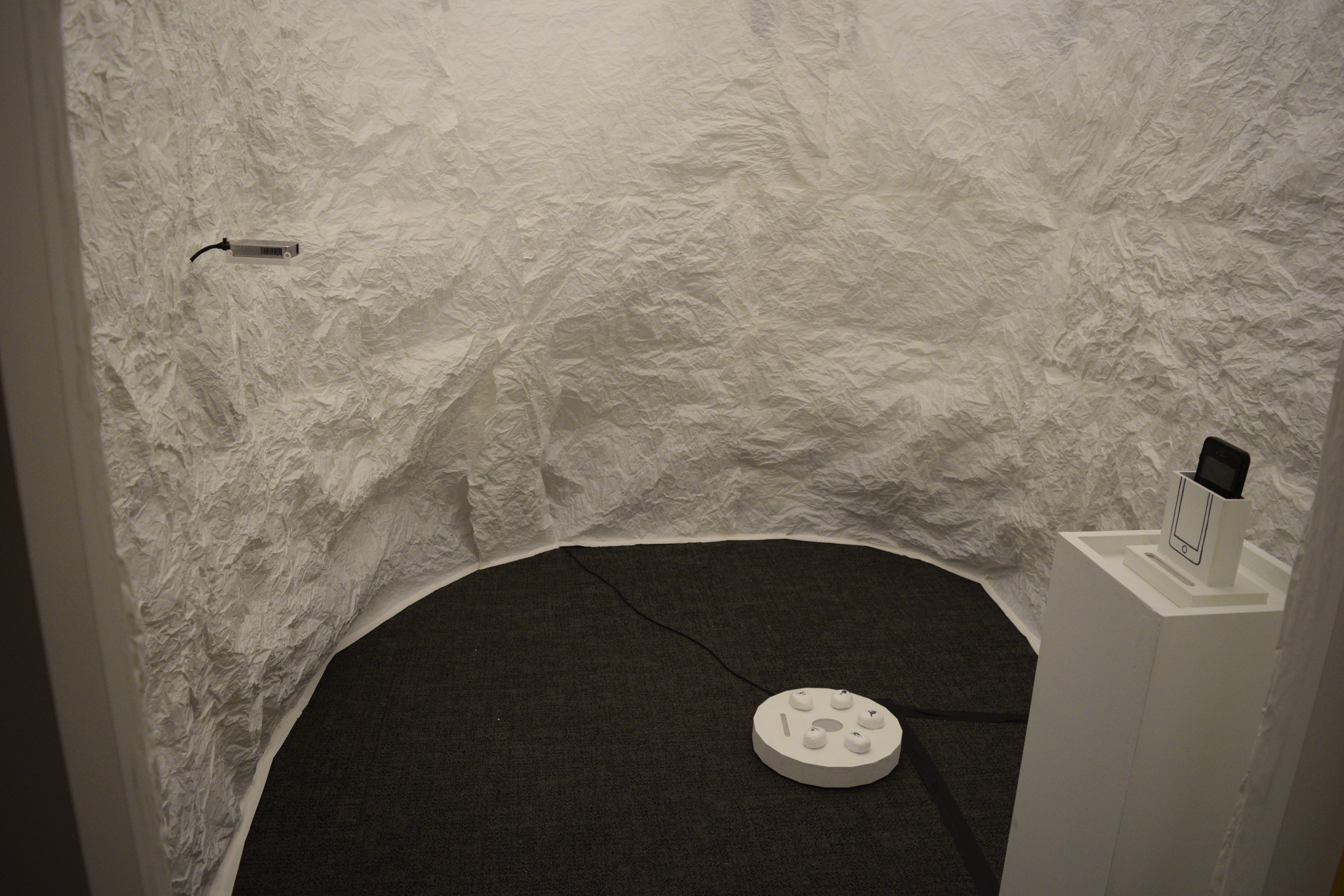 We changed the shape of the room using wire, and then could mount our crinkled wallpaper to create the textured feel. The paper worked very well to diffuse the light from the Neopixels, and was also a nice material to project onto.