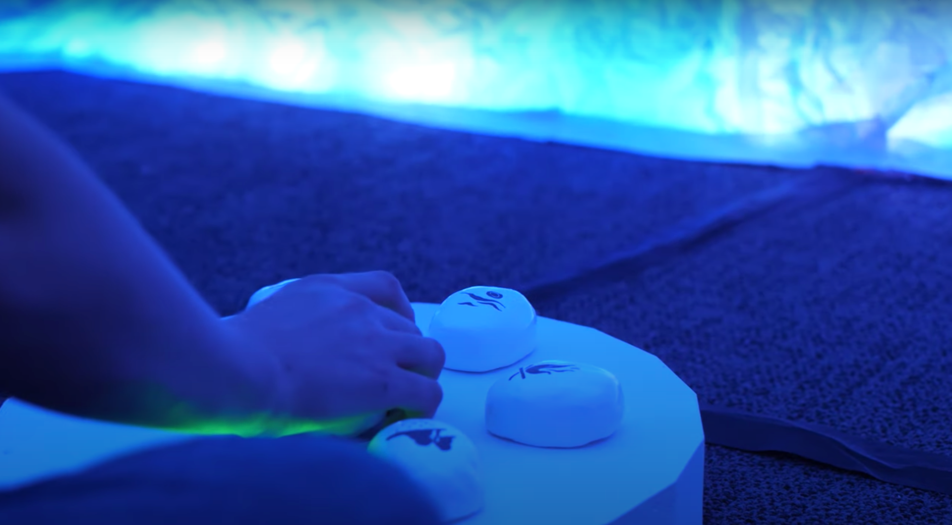 We had Neopixels mounted around the top perimeter of the room, which changed colors based on the environment selected. These strands remained static but provided the main color shift. Along the bottom of the room were more dynamically programmed Neopixels that provided more life to each of the environments.